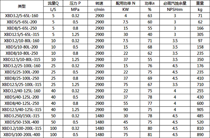 XBD-DL型消防泵主要性能參數表